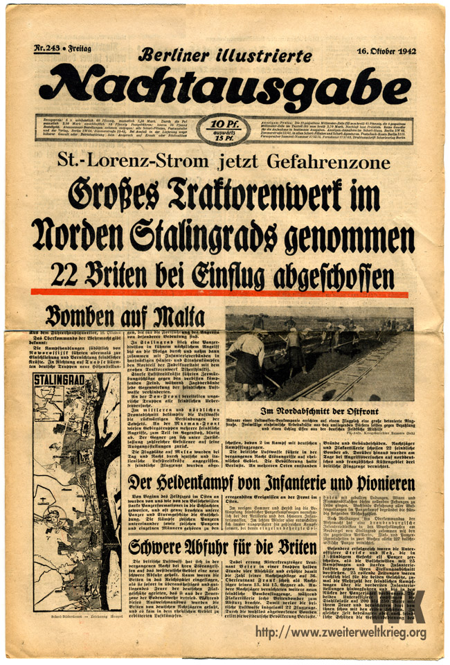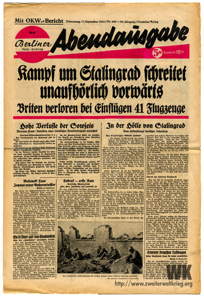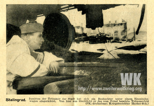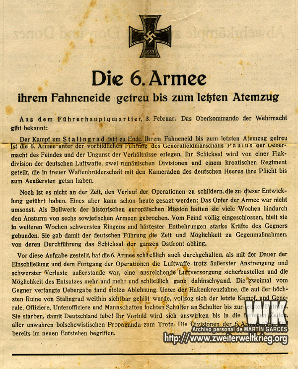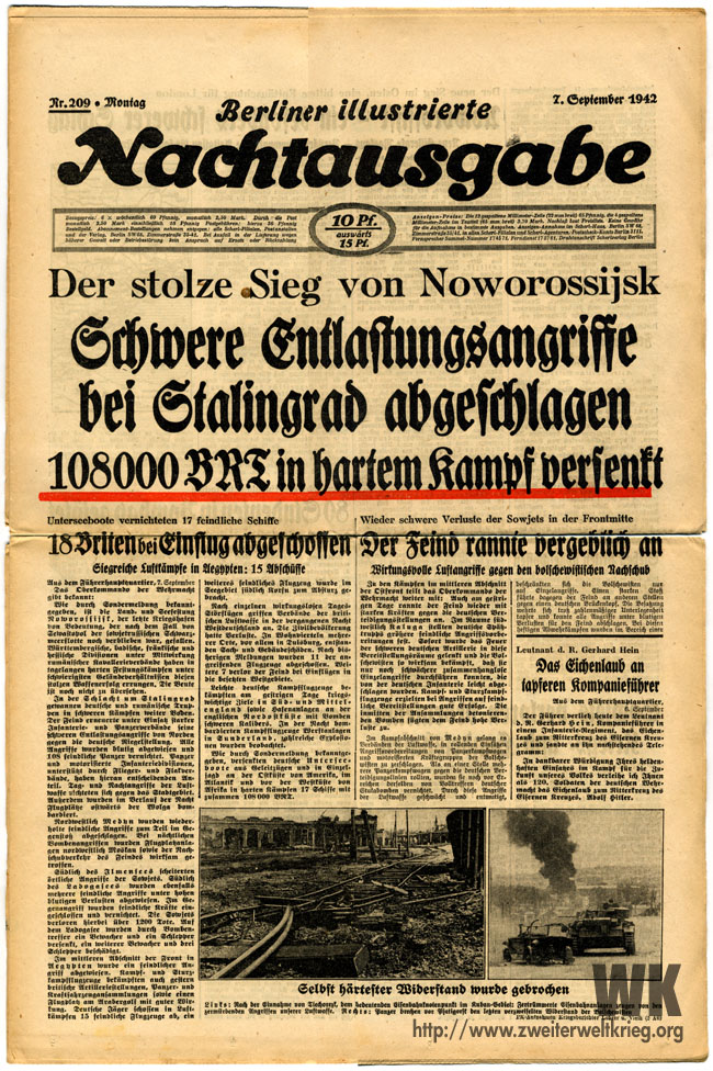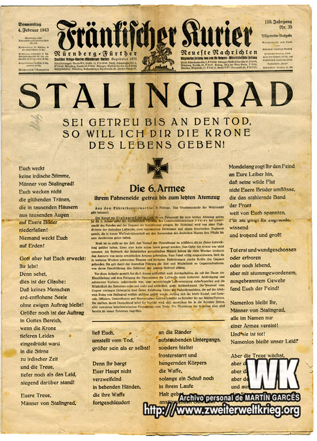 En la misma medida, como las cortas informaciones de grandes victorias dejan entrever logros heroicos, así se esconden tras las escasas palabras de los informes de la Wehrmacht sobre Stalingrado, un himno de heroísmo y el glorioso ejemplo de la fuerza militar de todo un pueblo. Desde hace seis semanas, Stalingrado está rodeado por inimaginables tropas y material, que arremeten contra un puñado de héroes, que defienden la cultura y la civilización europea.