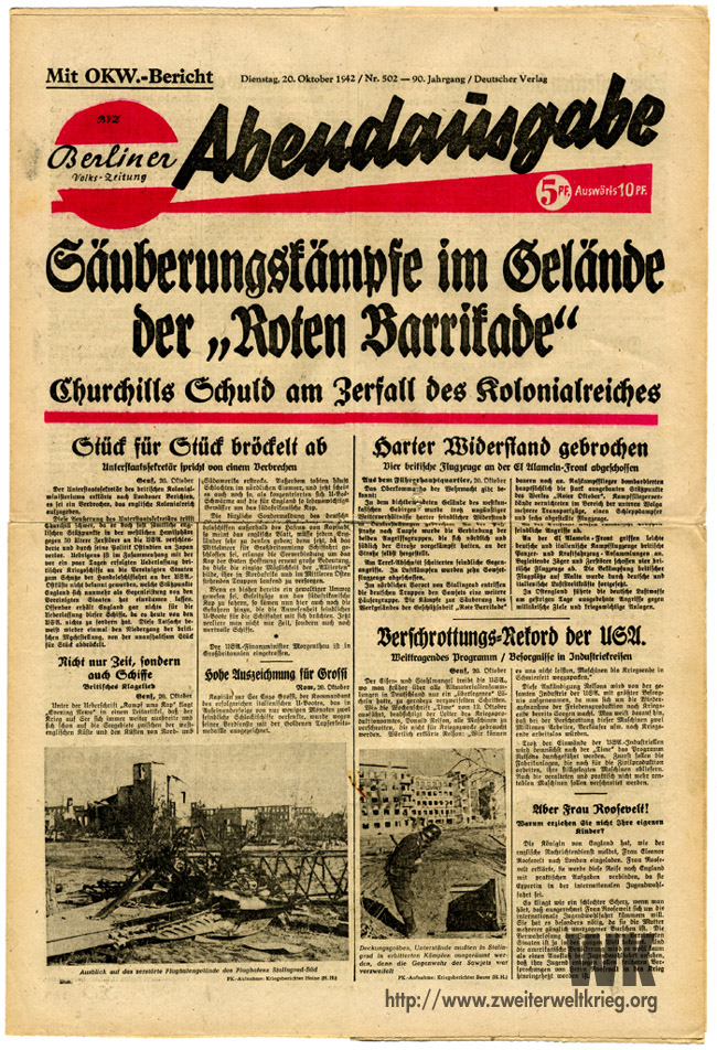 El pueblo español sigue la lucha heroica de los defensores de Stalingrado con profunda admiración, como se refleja en las primeras páginas de los periódicos. En estos días se habla de los Héroes del Alcázar de Toledo, cuya feroz resistencia hizo posible el primer ataque sobre el Madrid rojo y con ello se contribuyó ala victoria final del movimiento nacional. "Con la misma brevedad" así escribe Informaciones en un comentario sobre Stalingrado, con la que el alto mando alemán dio a conocer la conquista de París, la consecución de la costa Atlántica y la conquista de todos los países, se esboza ahora también la lucha por Stalingrado.