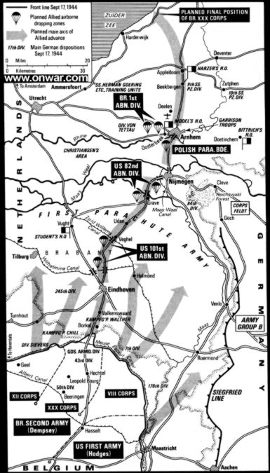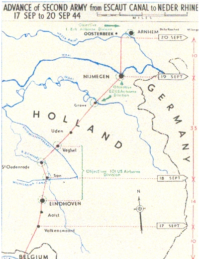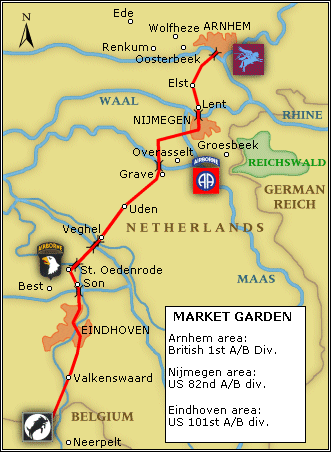 • 101ª DA USA. Los hombres de Taylor debian de lanzarse al norte de Eindhoven, y rapidamente ese mismo dia despejar la ruta Eindhoven-Son-S,Oedenrode-Veghel. En el camino debian tomar y asegurar el puente sobre el Canal de Wilhelmina, cerca de Son, el puente sobre el rio Dommel, en San Oendenrode, y los puentes sobre el canal Willen y el rio AA, en la ciudad de Veghel. Al caer la noche, avanzarian sobre Eindhoven, que se preveia débilmente defendido. Browning, en un principio, ordeno a Taylor despejar la carretera hasta Grave,casi 70 kmt , pero Taylor protesto, siendo apoyado por Dempsey, y dejando al final un tramo de 20 Kmt. bajo su responsabilidad.