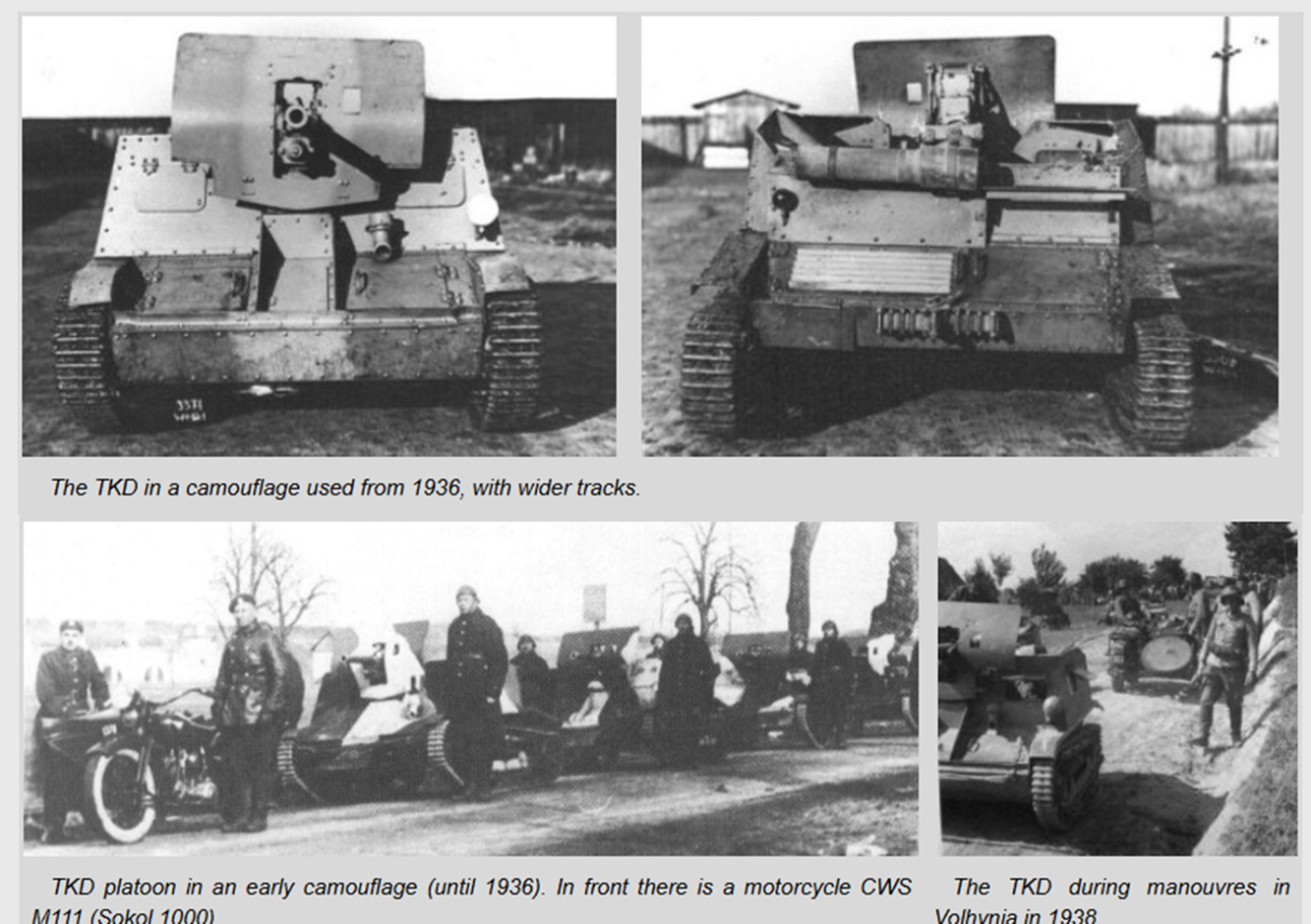 En el verano de 1937 el pelotón TKD fue asignado a la 10ª Brigada de Caballería motorizada para realizar ejercicios en Barycz, cerca de Kielce. En septiembre, participó en ejercicios en Pomerania, asignado a la Brigada de Caballería de Wielkopolska. A mediados de 1938, el pelotón TKD fue asignado al pelotón antitanque de la recién creada unidad de reconocimiento de la 10ª Brigada de Caballería; sin embargo, según algunas fuentes, para entonces solo contaba con dos TKD en el pelotón, junto con dos TKS-D. Se emplearon en ejercicios de la 10ª Brigada de Caballería en Barycz en agosto de 1938, y posteriormente en grandes maniobras en Wołyń (Volhynia) en septiembre de 1938. Según una nueva publicación, los vehículos del TKD regresaron a Modlin posteriormente y no participaron en la reconquista de la provincia checa de Zaolzie en octubre de 1938, como afirmaban tradicionalmente la mayoría de las publicaciones, aparentemente basándose en la foto del título.