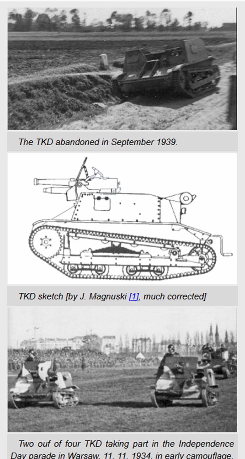 El TK-3, aunque barato, tenía una serie de problemas, principalmente en relación con la débil protección del blindaje y la potencia de fuego. Por esta razón, el ejército polaco inició el desarrollo de una nueva versión de apoyo basada en el TK-3 con mayor potencia de fuego. Por esta razón, los polacos comenzaron a trabajar en un prototipo armado con el cañón experimental wz.35 de 4,7 cm (desarrollado en el país) montado en una tanqueta TK-3. Este vehículo se conocería como TKD, pero resultó decepcionante principalmente debido al bajo rendimiento del cañón de 4,7 cm y, por lo tanto, solo se construyeron unos pocos. Otro intento de aumentar la potencia de fuego del TK-3 fue agregar un cañón de 20 mm en lugar de su ametralladora. Si bien esta instalación se probó en un vehículo, no se construyeron más vehículos.