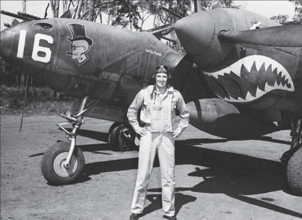 El capitán Bob Faurot, del 39º Escuadrón de Caza, posa con su P-38F, con su distintivo distintivo, en Port Moresby a principios de 1943. Falleció en la misma acción en la que murió el as pionero del P-38, el teniente Hoyt Eason, el 3 de marzo de 1943.