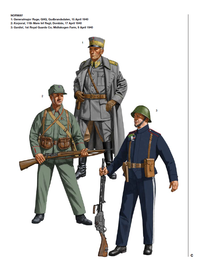 Sirviendo en uno de los regimientos que derrotaron a los paracaidistas alemanes, este comandante de sección (nótese la barra de rango en los puños) viste el uniforme de campaña M1914 con gorra de invierno, guerrera con cuello y puños rojos, y pantalones holgados. En el pecho izquierdo se aprecian la insignia de tirador de bronce y la insignia de marcha M1936 de plata. Su equipo de campaña incluye un cinturón de cuero marrón y correas de soporte, con dos cartucheras y la bayoneta para su fusil Krag-Jørgensen M1894 de 6,5 mm. Lleva una cantimplora de hojalata M1914 o M1934 con funda de tela gris en la cadera derecha, y una bolsa de pan de lona M1894 y una bolsa para máscara de gas M1934 a la izquierda. Aquí se ocultan la mochila de lona caqui Bergan M1899 y la media chaqueta impermeable verde.