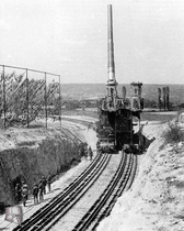 Mientras, unidades de ferrocarriles, reforzaban el suelo de esa enorme trinchera para que pudiera soportar los enormes pesos a que se veria sometido. En la entrada de esta trinchera de tiro se construyo una explanada ferroviaria de mas de un kilometro para en ensamblaje de todas las piezas del cañon.