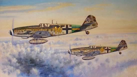 Por parejas nuestros pilotos atacan a las fortalezas. Hoy llevo a mi lado a un joven sargento que sale por primera vez, esta es su primera misión de combate y hay una buena oportunidad para que también logre su primera victoria... si no pierde la cabeza.