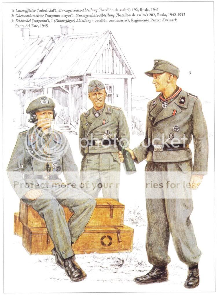 Y el uniforme, feldgrau si es en divisiones de infantería y negro para divisiones panzer y panzergrenadier.