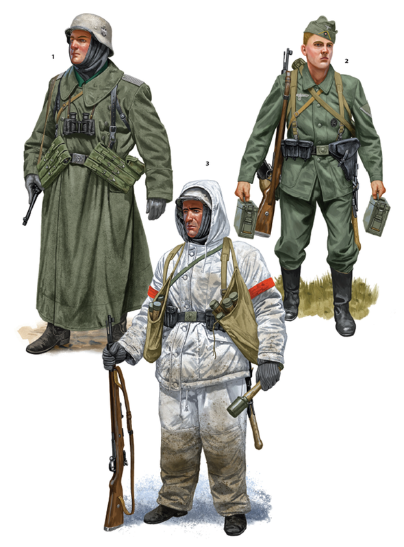 Contra el intenso frío, este oficial de la 20ª División de Infantería Motorizada lleva una bufanda tubular/pasamontañas bajo su casco M1935 pintado de blanco, y una sobrevesta M1940 (chaqueta de guardia) sobre su abrigo M1935, del que ha transferido las hombreras. Lleva el equipo de comandante de pelotón; se aprecian un cinturón de tropa y correas de soporte con portacargadores para su MP40 y unos prismáticos pequeños 6x30. También llevaría una pala de trinchera y, posiblemente, una bayoneta; una bolsa de pan, una cantimplora y una botella de agua; y un cartucho de máscara antigás colgado a la espalda.