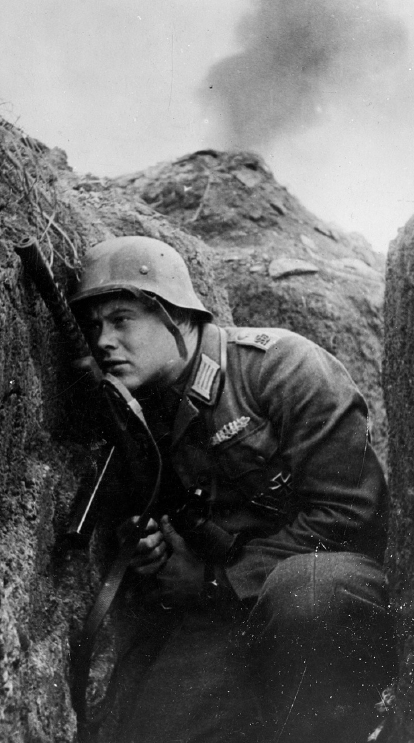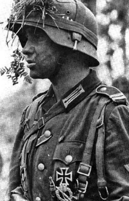Este teniente, comandante de pelotón del Regimiento de Granaderos Panzerde la Gross Deutschland, se resguarda del fuego enemigo en una trinchera cerca de Iasi, al este de Rumania, en junio de 1944; obsérvese el humo de la explosión de un proyectil al fondo. Lleva un casco M1942 con un patrón de puntos pintado; una túnica de campaña gris de soldado raso M1941 con parches de oficial M1935 en el cuello; y hombreras M1940 con el monograma "GD" de metal dorado. Sus condecoraciones son la Insignia de Combate Cuerpo a Cuerpo M1942 y la Cruz de Hierro de 1.ª Clase. Curiosamente, su subfusil es un Beretta Modelo 38A italiano.