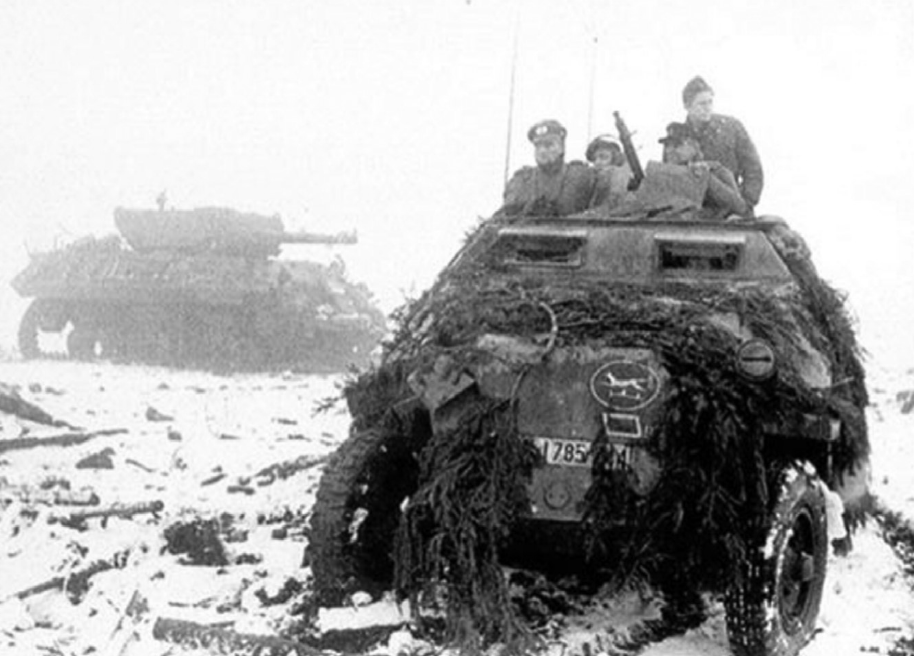 Un vehículo blindado de transporte de personal SdKfz 251 del I Batallón del 60º Regimiento Panzergrenadier, de la 116ª División Panzer, avanza a través de las líneas estadounidenses durante la Batalla de las Ardenas, en diciembre de 1944. A pesar de las ramas añadidas para camuflaje, el famoso emblema del vehículo (y gorra) Windhund de la división es claramente visible en la placa frontal, sobre el símbolo táctico del batallón. El emblema conmemoraba a Sascha, un galgo ruso adoptado en el sur de Rusia por la 16ª División de Infantería Motorizada, predecesora de la 116ª.