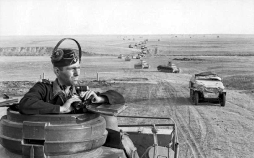 El polvoriento comandante de un tanque PzKw III del 24º Regimiento Panzer, 24ª División Panzer, en una larga columna de blindados avanzando por las interminables estepas del sur de Rusia, septiembre de 1942, camino a Stalingrado. Viste el uniforme Panzer negro M1935 con ribetes del amarillo de caballería de la división; las trabillas de las hombreras del candidato a suboficial sugieren que probablemente sea un Obergefreiter o un Gefreiter. El segundo vehículo es un vehículo blindado semioruga SdKfz 251, y los que se ven a lo lejos parecen ser tanques ligeros PzKw II.