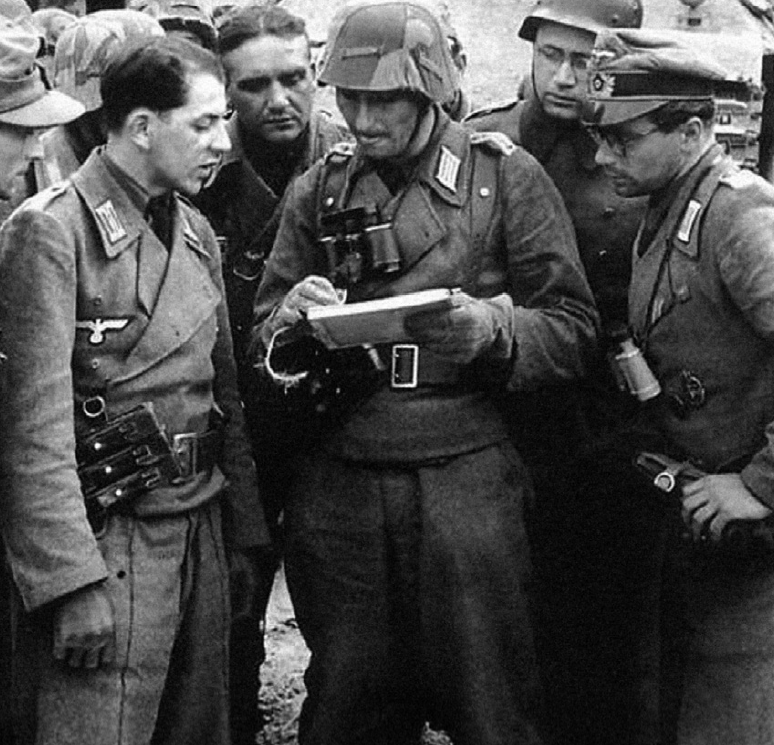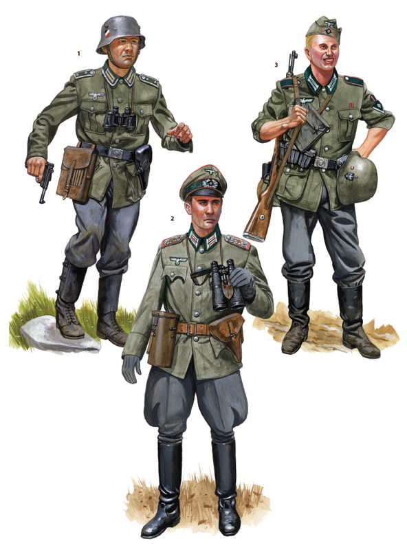 Un teniente coronel, comandante de compañía, conversa con sus tenientes, comandantes de pelotón, todos vestidos con el uniforme especial de campaña gris M1940, con parches de cuello M1935 y portacargadores MP40. El teniente coronel lleva una funda de casco con patrón de astillas, y el teniente de la derecha, la gorra de campaña de oficial M1934.