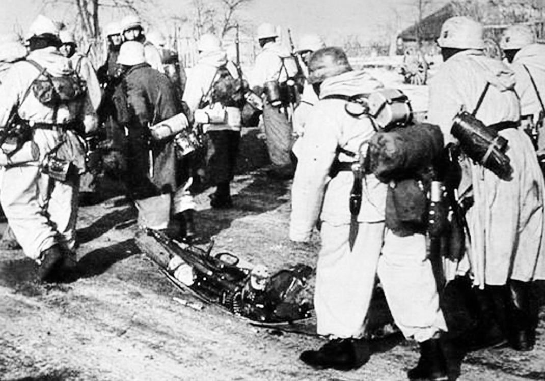 Sección de la 20ª División Panzergrenadier en marcha cerca de Smolensk, invierno de 1943/44; nótese la ametralladora y otros equipos arrastrados en el trineo. La mayoría lleva cascos pintados de blanco (con el emblema del águila de la Wehrmacht M1934) y uniformes de invierno acolchados reversibles M1942 o (a la derecha) sobrechaquetas blancas de algodón con capucha sobre sus abrigos. El soldado en primer plano lleva una mochila de combate con estructura en A sujeta con correas M1939, con su cantimplora M1931 sobre una tienda de campaña enrollada M1931. En su cinturón lleva la bayoneta, la bolsa de pan M1931 y la cantimplora M1931.