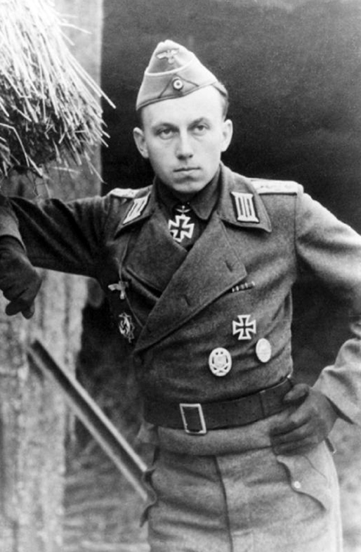Un joven oficial Panzergrenadier con numerosas condecoraciones posa despreocupadamente para una fotografía en 1942. Viste la gorra de campaña de oficial M1938, con corona plateada y ribete festoneado, y el galón verde prado de su unidad, abolido en julio de 1942. La chaqueta cruzada de su uniforme especial de campaña gris M1940 lleva parches de cuello de oficial M1935 y hombreras de campaña M1940. Luce la Cruz de Caballero, la Cruz Alemana en Plata en el pecho derecho y, en el izquierdo, la Cruz de Hierro de Primera Clase, la Insignia de Asalto General y una Insignia de Herido de Plata.