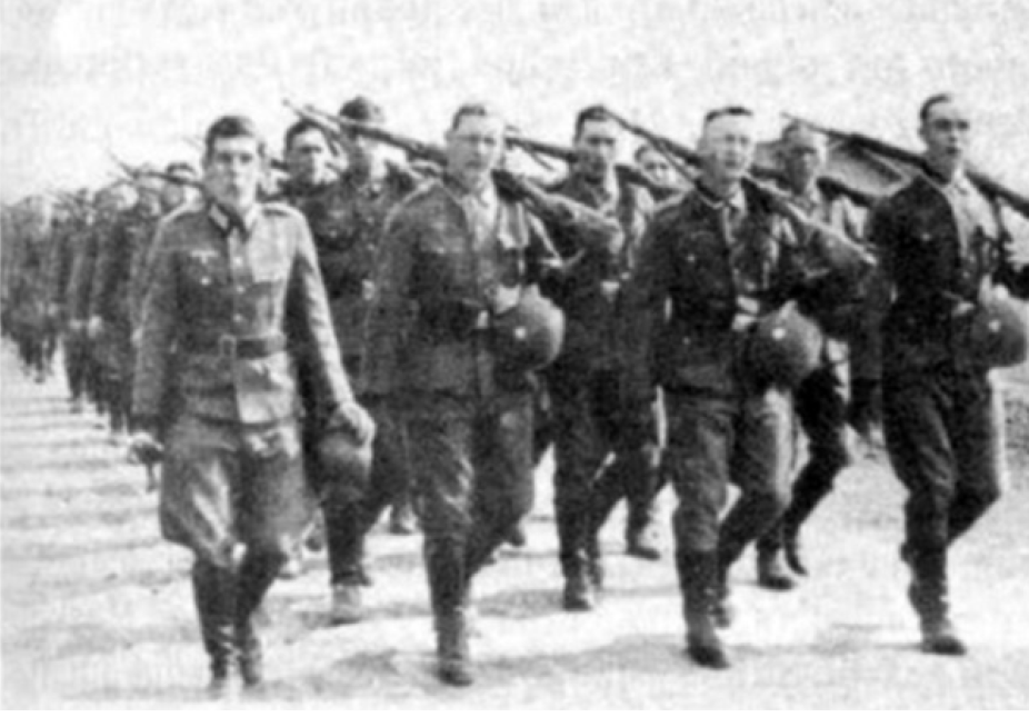 La Compañía del Cuartel General (Stabskompanie) del I Batallón/11º Regimiento de Fusileros de la 9ª División Panzer en marcha en Francia, mayo de 1940; el comandante de la compañía se ve al frente a la izquierda. Marchando con tranquilidad, se encuentran claramente muy por detrás de la línea del frente. Este regimiento había sido el 2º Batallón Motorizado «Radetsky» del Ejército Austriaco; fue rebautizado como 11º Regimiento de Fusileros de Caballería el 1 de agosto de 1938 y como 11º Regimiento de Fusileros el 19 de marzo de 1940.