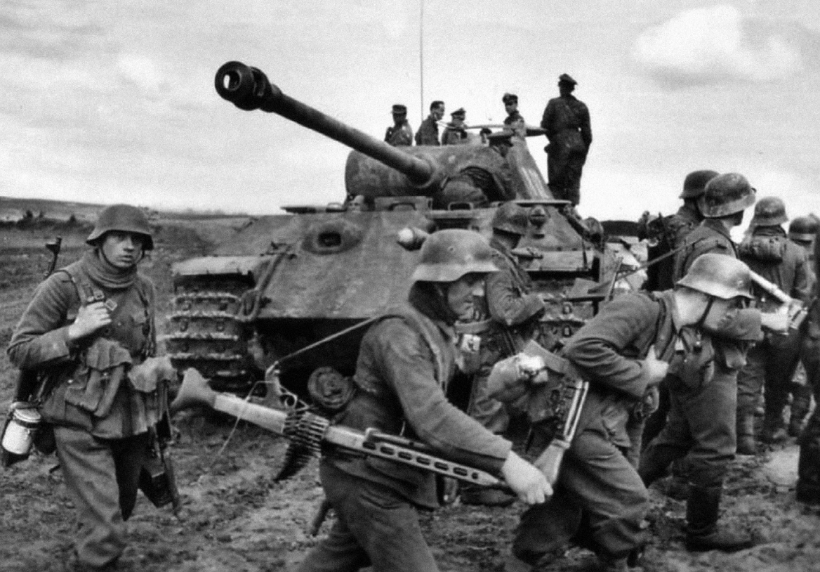 En primer plano, un equipo de tres ametralladoras ligeras, probablemente de la 4ª o la 5ª División Panzer, pasa junto a un tanque PzKw V Panther cerca de Kovel, al noroeste de Ucrania, entre marzo y julio de 1944. El primer artillero lleva la MG42 colgada, mientras sus compañeros (izquierda y derecha), ambos armados con fusiles de asalto StG 44, manipulan las pesadas cajas de munición.