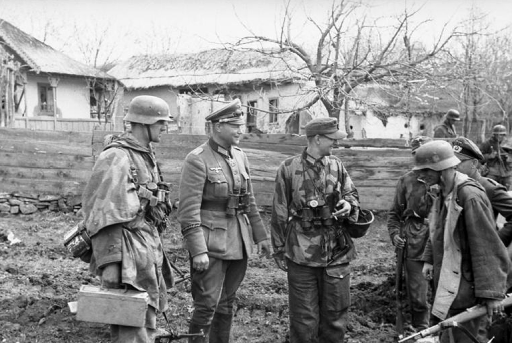 El coronel Karl Lorenz (segundo desde la izquierda), quien mandó el Regimiento de Granaderos Panzer Grossdeutschland del 14 de mayo de 1943 al 1 de agosto de 1944, aparece en la fotografía cerca de Kirovhrad, Ucrania, en enero de 1944. El teniente coronel Wentzke (tercero desde la izquierda), al mando de la 16ª Compañía (Artillería de Infantería) del regimiento, viste una chaqueta de camuflaje M1942 de primera generación con un patrón de camuflaje muy marcado; el gran bolsillo del muslo izquierdo parece corresponder a los pantalones verde caña del uniforme especial de campaña M1941. El soldado de la izquierda lleva su tienda Zeltbahn (que parece tener un patrón de camuflaje más suave) a modo de poncho sobre una chaqueta de camuflaje o una chaqueta reversible. A la derecha se muestra un ejemplo del uniforme de invierno reversible M1942 gris/blanco, usado con el lado gris hacia afuera.