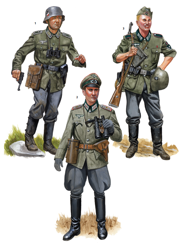 Este comandante de batallón de la 90ª División Ligera viste el uniforme tropical de oficial M1940. Su gorra de campaña, muy desteñida por el sol, tiene la corona y el ribete frontal de alambre de aluminio de oficial, pero insignias estándar de tropa en gris azulado sobre fondo marrón, como también en su pecho derecho. Sus parches de cuello y hombreras deberían mostrar el color verde prado característico de esta unidad, pero como veterano oficial de los Rifles de Caballería, conserva el amarillo. También lleva la insignia de brazalete M1941 y exhibe la Cruz de Hierro de 1914 de 1ª y 2ª clase con barras de 1939, la Insignia de Asalto de Infantería Motorizada M1940 y una Insignia de Herido de plata. Lleva pantalones de montar tropicales con botas altas de lona y el cinturón tropical M1940, poco común entre los oficiales.