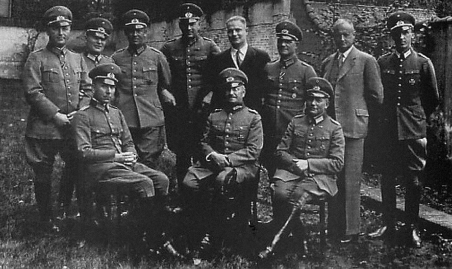 El general Oswald Lutz, inspector de tropas motorizadas (sentado en el centro) y su estado mayor en 1933. A la derecha, su jefe de estado mayor, el teniente coronel Heinz Guderian, quien mandaría el 2º Grupo Panzer durante Barbarroja en 1941; a la izquierda, el mayor Walther Nehring, quien mandaría el Afrikakorps en 1942. Aunque Guderian alcanzó una fama y reputación más duraderas, es Lutz a quien se considera hoy el padre de las tropas Panzer. Cabe destacar el uniforme de servicio Reichsheer M1920 con la guerrera de ocho botones, aún popular durante el Tercer Reich. La escarapela provincial, que se llevaba en la parte delantera de la gorra, sería reemplazada en febrero de 1934 por el águila y la esvástica.