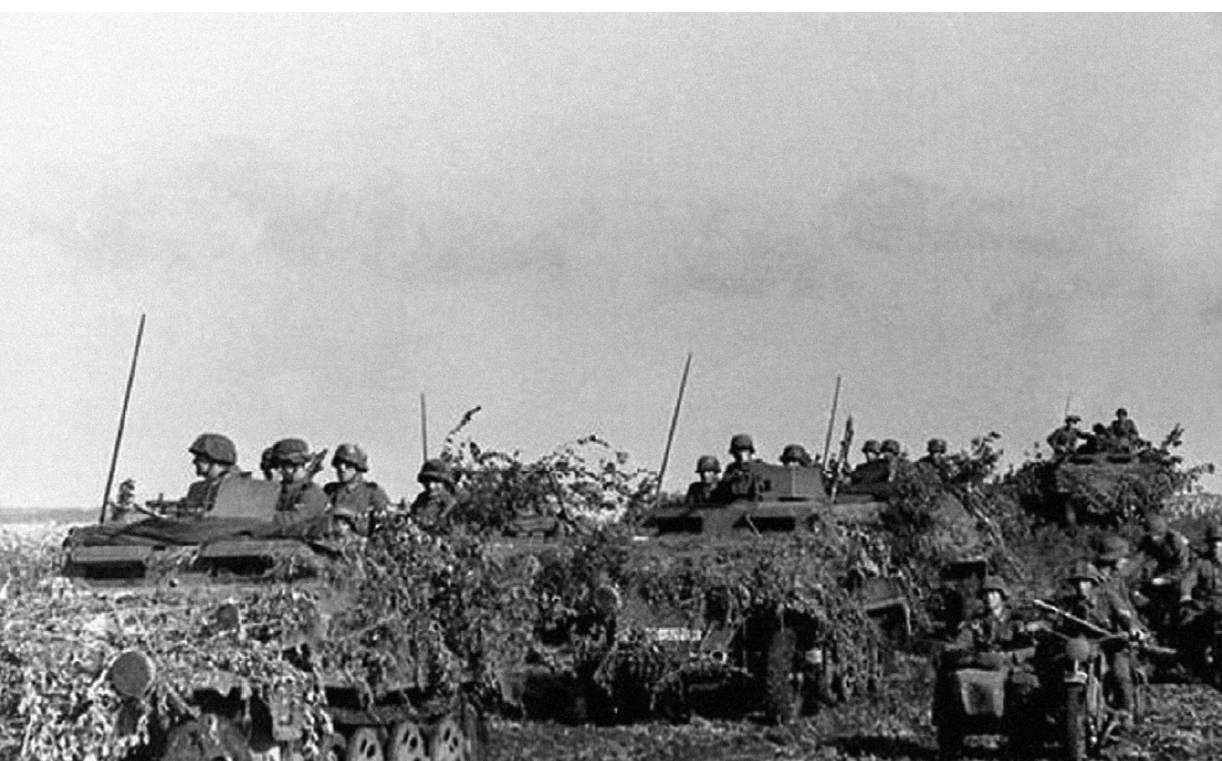 Ucrania, verano de 1944: Un pelotón de Panzergrenadiers blindados avanza en vehículos blindados SdKfz 251, bien cubiertos con redes de camuflaje y ramas; las tropas llevan cubrecascos, pero aparentemente no chaquetas de camuflaje. El conjunto de motocicletas es probablemente de la compañía del cuartel general del regimiento, que contaba con un pelotón de motocicletas para reconocimiento y enlace.