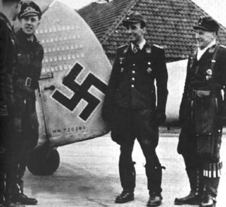 El teniente Heinz Wolfgang Schnaufer con sus compañeros tras la obtención de la 47ª victoria en el timón de su Messerschmitt Me-110G en St. Trond en febrero de 1944.