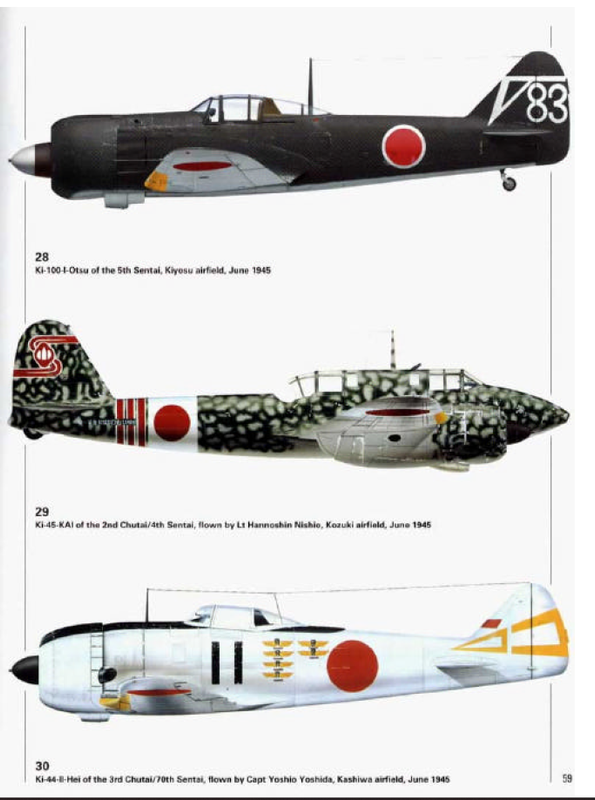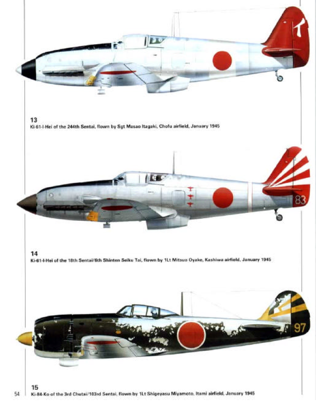 Este es el Ki-61 No 3024 (ver perfil 10) pero en fecha posterior, con diez siluetas dde B-29 y un par de Hellcats dibujados debajo de la cabina. Era la montura del comandante del grupo, el capitán Teruhiko Kobarashi. Su sexta victoria está embellecida con un Ki-61 rojo rociado sobre el B-29 blanco -denotando una victoria por embestida- en el Monte Fuji. Para reforzar la moral de sus pilotos, el jefe del sentai pintó la palabra Hissho (confianza en la victoria) en la cola de su caza con pintura blanca.