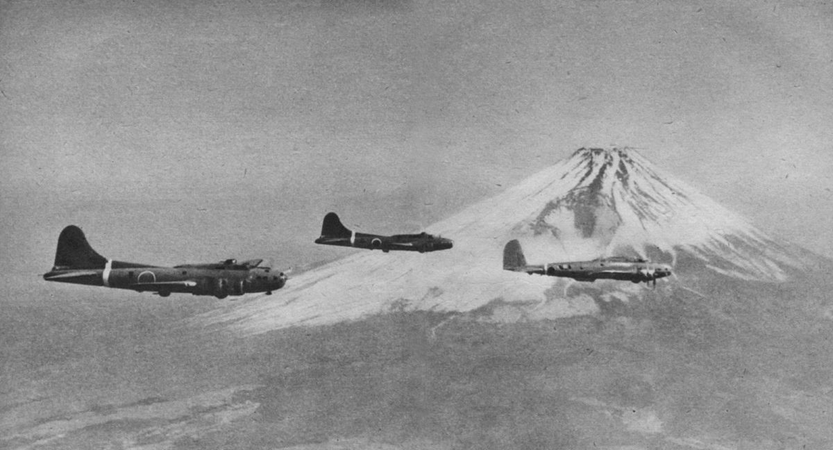 El B-17D 40-3095 en vuelo cerca del Monte Fuji a finales de 1942, después de ser capturado en Clark Field en Filipinas en diciembre de 1941, liderando un par de bombarderos B-17E Flying Fortress que fueron ensamblados por técnicos japoneses a partir de aviones abandonados en las Indias Orientales Holandesas.